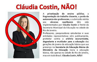 A privatização do ensino público, a fragmentação do trabalho docente, a perda da autonomia dos professores, a submissão estrita aos cânones neoliberais têm sido implementados por Cláudia Costin à frente da Secretaria Municipal da Educação na cidade do Rio de Janeiro.