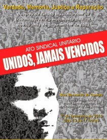 São Bernardo do Campo recebe no dia 1º de fevereiro de 2014 o Ato Sindical Unitário ‘Unidos, Jamais Vencidos’ que homenageará trabalhadores e sindicalistas que sofreram perseguição e repressão do regime militar e das empresas no período da ditadura. A atividade acontecerá à partir das 13h no Teatro Cacilda Becker, no centro da cidade.
